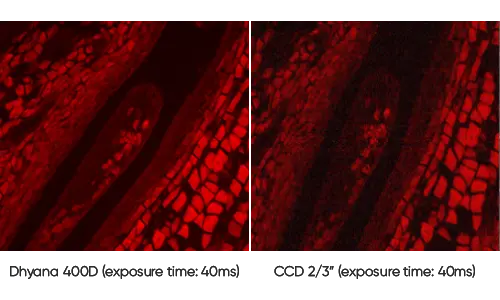 Dhyana 400D работает при температуре -15 °C, что обеспечивает длительную надежную работу, значительно уменьшая количество горячих пикселей, вызванных накоплением темнового тока, и получая более чистое флуоресцентное фоновое изображение.