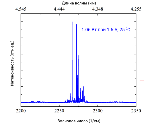 Рис. Спектр излучения FP-QCL лазера с центральной длиной волны 4,4 мкм