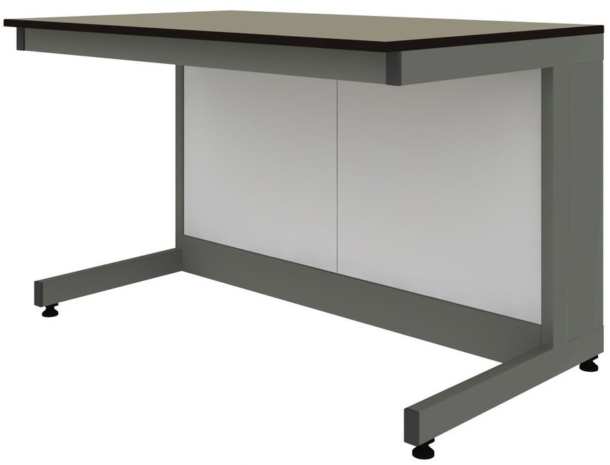 Столы лабораторные пристенные на металлическом каркасе. Размеры стола: 1200 или 1400 мм в ширину. Каркас стола изготовлен из металлической профильной трубы прямоугольного сечения 60х30х2 мм. Нерабочие поверхности изготовлены из металлического холоднокатного листа. Металл покрывается химически стойкой эпоксиполиэфирной порошковой краской. Боковые опоры столы С-образного вида. Конструкция стола позволяет беспрепятственное крепление технологического стеллажа (поставляется отдельно), подвесных тумб различной конфигурации. Стол в собранном виде выдерживает статическую нагрузку 250 кг при условии равномерного распределения нагрузки по рабочей поверхности стола.