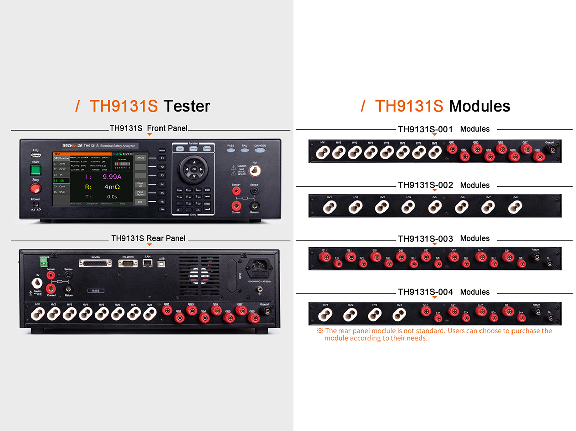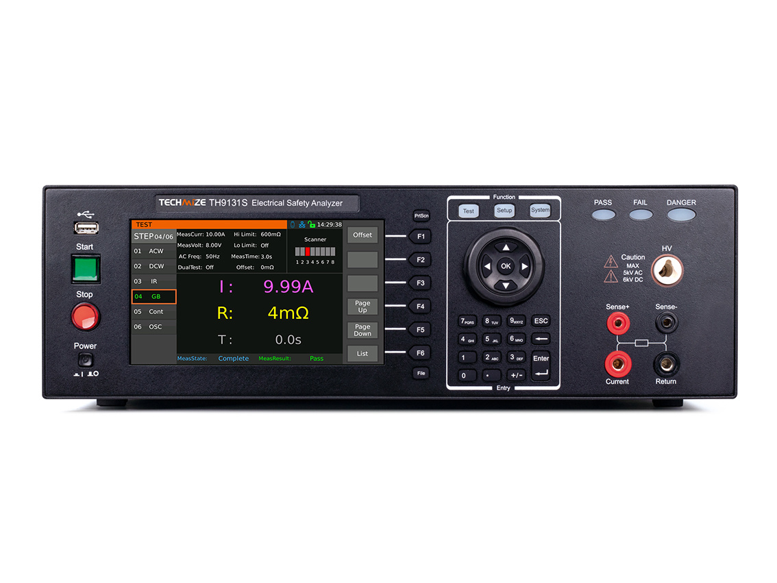 - Комплексная тестовая система «пять в одном» с следующими функциями: 1) Испытание на устойчивость к переменному напряжению; 2) Испытание на устойчивость к постоянному напряжению; 3) Испытание сопротивления изоляции; 4) Испытание контакта заземления; 5) Испытание на непрерывность.