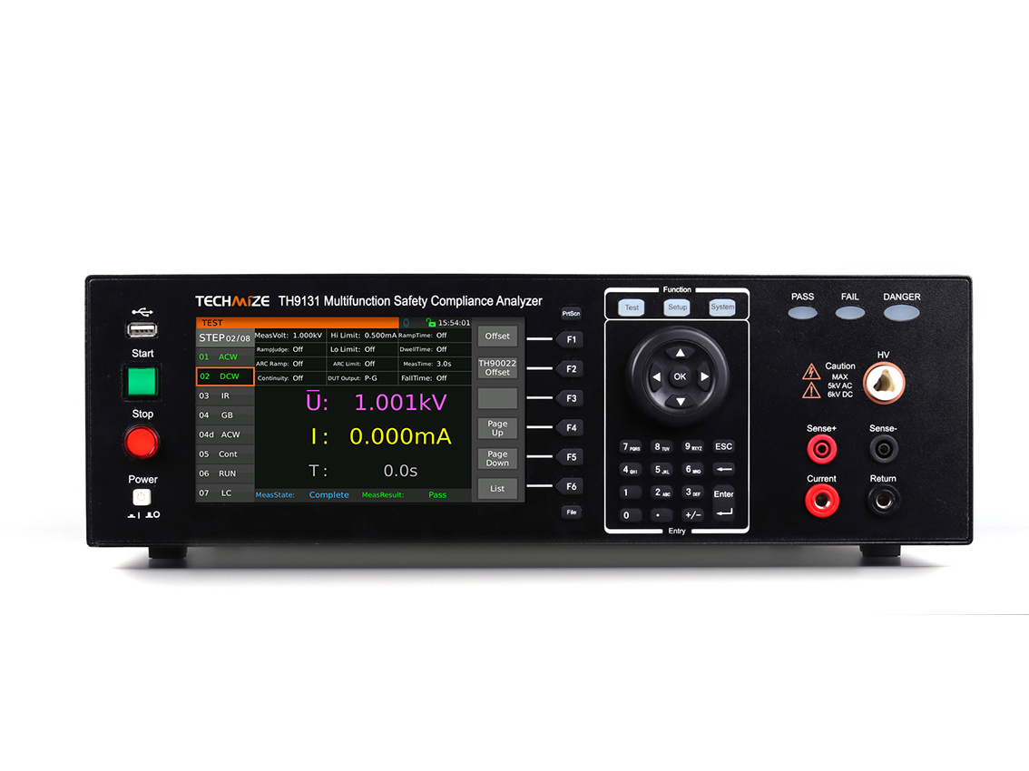 - Комплексная тестовая система «семь в одном» со следующими функциями: 1) Испытание выдерживаемого переменного напряжения; 2) Испытание выдерживаемого постоянного напряжения; 3) Испытание сопротивления изоляции; 4) Тест заземляющего соединения; 5) Проверка непрерывности цепи; 6) Испытание на утечку тока; 7) Испытание электрических характеристик.