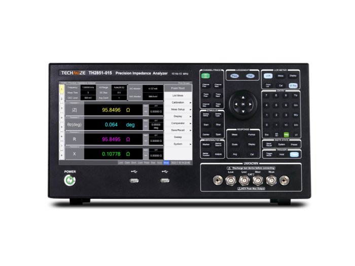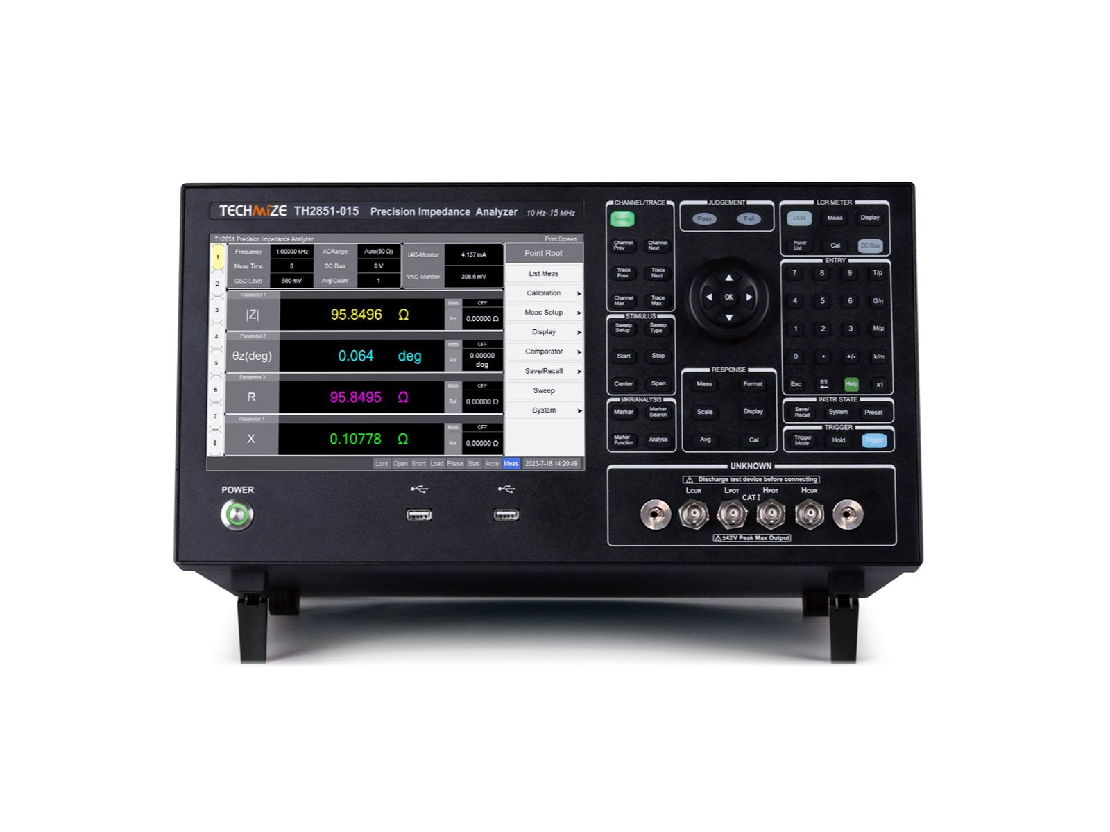 Анализатор импеданса TH2851 компании Techmize имеет пять опций диапазона частот от 10 Гц до 15 МГц позволяют выбрать наиболее подходящую опцию с учётом особенностей решаемых задач. Прибор обеспечивает лучшее в отрасли типовое значение основной погрешности измерений 0,045% в широком диапазоне значений импеданса с использованием встроенного источника смещения по постоянному току до 40 В. Функция анализа эквивалентных схем поддерживает семь различных многопараметрических моделей и позволяет моделировать собственные значения эквивалентных параметров компонентов.