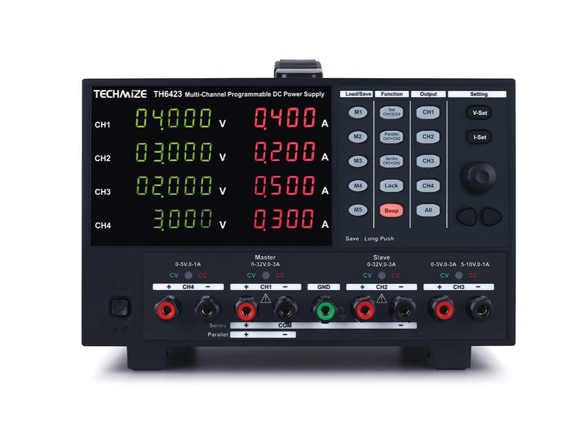 Номинальные характеристики: CH1 – 0-32 В/0-3 A/96 Вт, CH2 – 0-32 В/0-3 A/96 Вт, CH3 – 0-5 В/0-10 В, 0-3 A/0-1, 15 Вт/10 Вт, CH4 – 0-5 В/0-1 A/5 Вт. Автоматическое переключение между режимами CC и CV. Функция последовательного и параллельного соединения каналов 1 и 2. Интерфейсы: RS232, USB DEVICE. Габариты – 215×133×268 мм, вес – 6.4 кг.