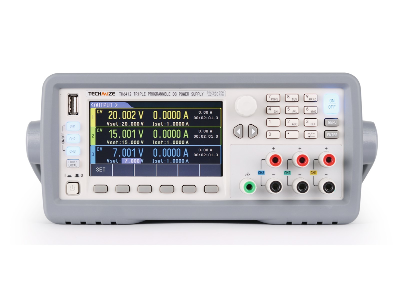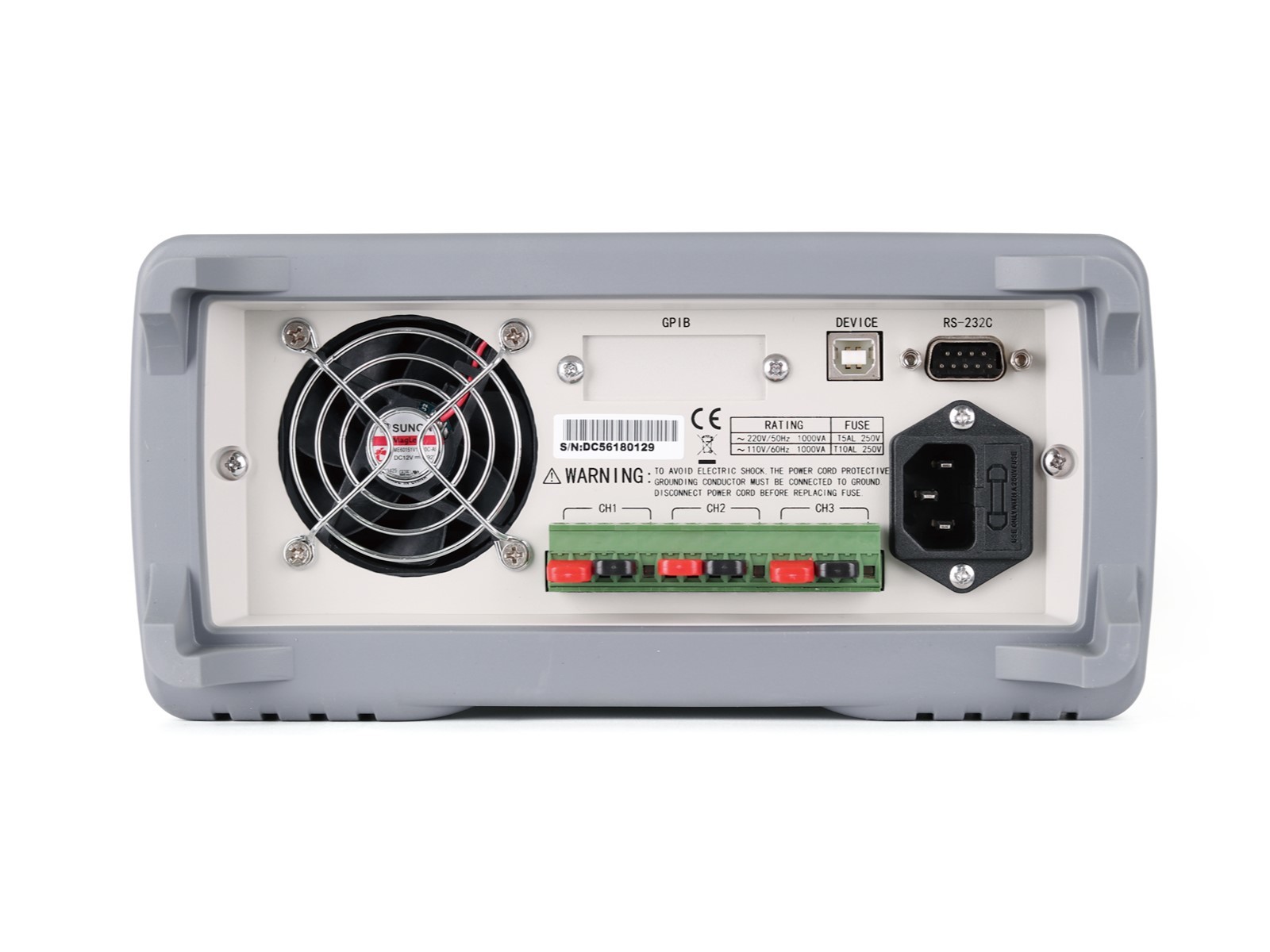 Номинальные выходные параметры: каналы 1 и 2 – 0-30 В/0-6 A/180 Вт, канал 3 – 0-6 В/0-5 A/30 Вт. Таймер работы: время выхода (0,1–99999,9 с). 4,3-дюймовый TFT-дисплей с 24-битным цветом, разрешение 480х272. Интерфейсы: RS232, USB HOST, USB DEVICE, опция – GPIB. Габариты –235x105x487 мм, вес – 13 кг.