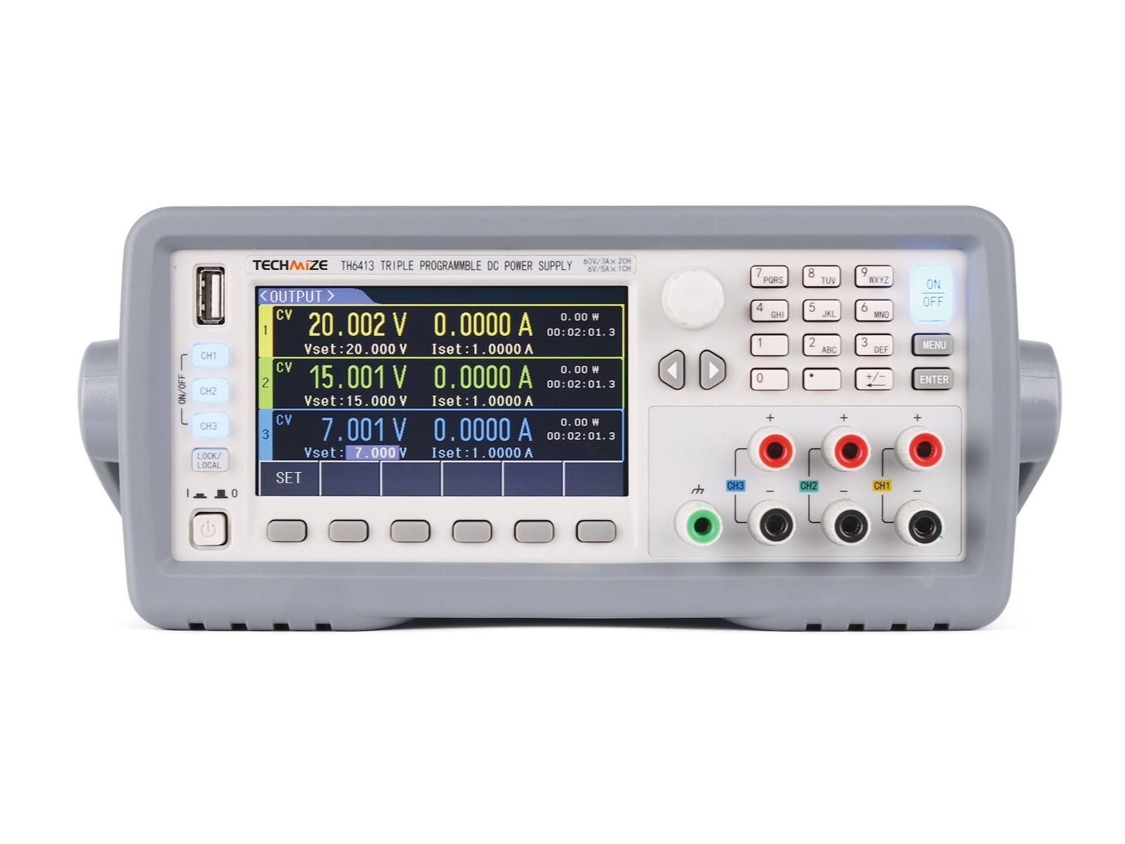 Номинальные выходные параметры: каналы 1 и 2 – 0-60 В/0-3 A/180 Вт, канал 3 – 0-6 В/0-5 A/30 Вт. Таймер работы: время выхода (0,1–99999,9 с). 4,3-дюймовый TFT-дисплей с 24-битным цветом, разрешение 480х272. Интерфейсы: RS232, USB HOST, USB DEVICE, опция – GPIB. Габариты –235x105x487 мм, вес – 13 кг.