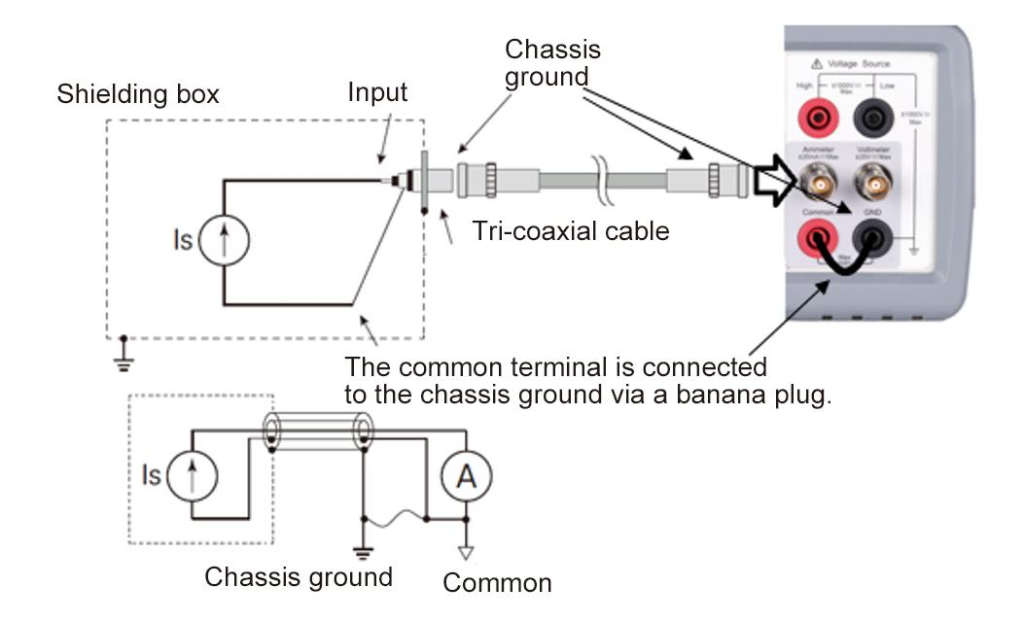 Измерение напряжения. Модели TH2690 и TH2690A могут выполнять функции высокоомного вольтметра (электрометра). Диапазон измерения постоянного напряжения составляет от 1 мкВ до 20 В при входном сопротивлении более 200 ТОм. Настолько высокое входное сопротивление минимизирует ток утечки через прибор при измерении напряжения, обеспечивая точные результаты даже на объектах с очень большим внутренним сопротивлением. Для подавления влияния паразитных токов утечки применяется триаксиальное соединение с активным экранированием (guard): входной разъём выполнен трёхосным, причём внутренняя экранирующая оболочка удерживается на том же потенциале, что и измеряемый проводник, благодаря встроенному буферному усилителю. Такая схема существенно снижает токи утечки и погрешности при измерении как малых токов, так и высоких сопротивлений.