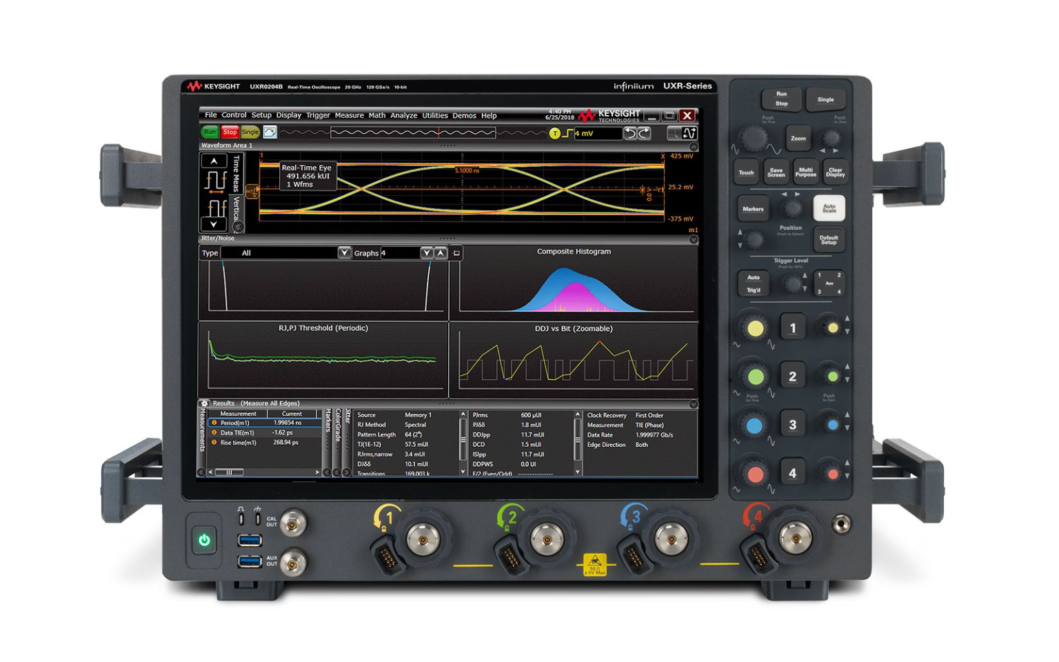 Измерительная архитектура UXR‑B построена на модульной системе захвата с использованием многочиповых фронтенд‑модулей и специализированных ASIC ускорения измерений. Каждый осциллограф включает до 16 высокоскоростных 10‑битных АЦП и несколько контроллеров памяти, что обеспечивает чрезвычайно высокую пропускную способность тракта данных и позволяет выполнять до нескольких триллионов операций в секунду в аппаратном режиме. Такая архитектура используется для ускорения вычислений БПФ (FFT), измерений джиттера, анализа временных интервалов, построения диаграмм «глаз» и других ресурсоёмких задач без снижения скорости обновления.