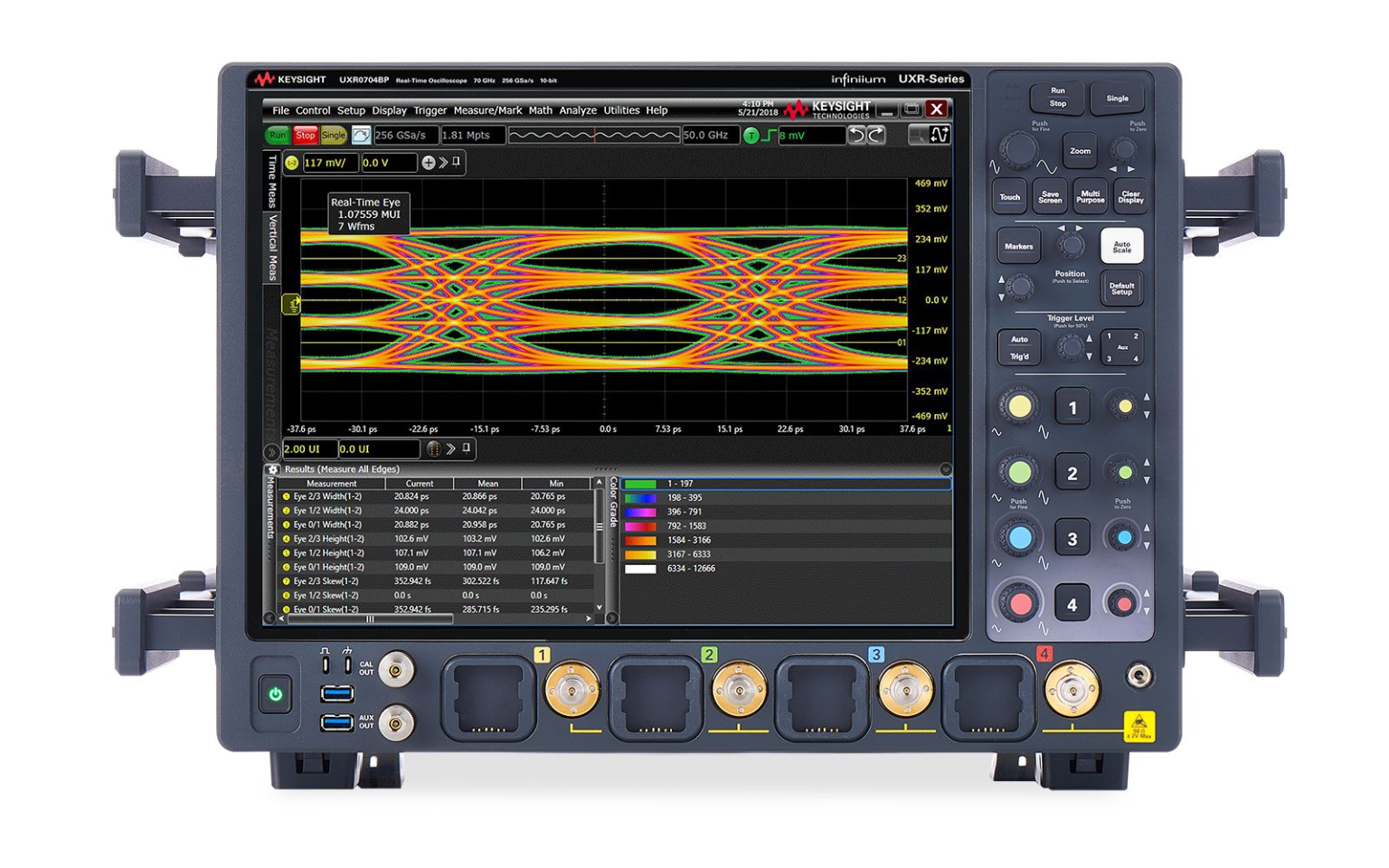 Измерительная архитектура UXR‑B построена на модульной системе захвата с использованием многочиповых фронтенд‑модулей и специализированных ASIC ускорения измерений. Каждый осциллограф включает до 16 высокоскоростных 10‑битных АЦП и несколько контроллеров памяти, что обеспечивает чрезвычайно высокую пропускную способность тракта данных и позволяет выполнять до нескольких триллионов операций в секунду в аппаратном режиме. Такая архитектура используется для ускорения вычислений БПФ (FFT), измерений джиттера, анализа временных интервалов, построения диаграмм «глаз» и других ресурсоёмких задач без снижения скорости обновления.
