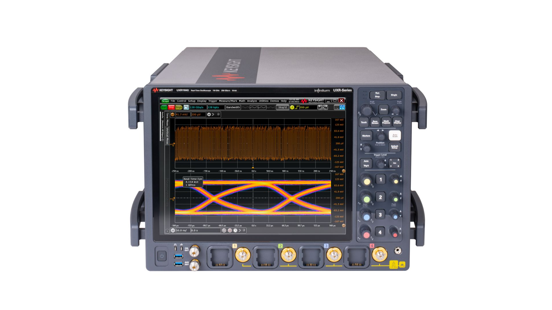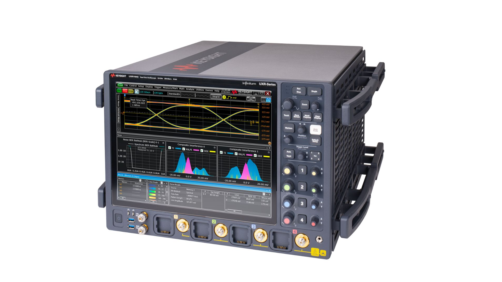 Измерительная архитектура UXR‑B построена на модульной системе захвата с использованием многочиповых фронтенд‑модулей и специализированных ASIC ускорения измерений. Каждый осциллограф включает до 16 высокоскоростных 10‑битных АЦП и несколько контроллеров памяти, что обеспечивает чрезвычайно высокую пропускную способность тракта данных и позволяет выполнять до нескольких триллионов операций в секунду в аппаратном режиме. Такая архитектура используется для ускорения вычислений БПФ (FFT), измерений джиттера, анализа временных интервалов, построения диаграмм «глаз» и других ресурсоёмких задач без снижения скорости обновления.