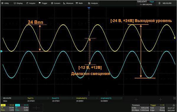 - Аналоговый выход 24 Впик-пик с наложением смещения постоянной составляющей ± 12 В, что обеспечивает максимальный выходной диапазон ±24 В (48 Впик-пик) на высокоомном выходе.