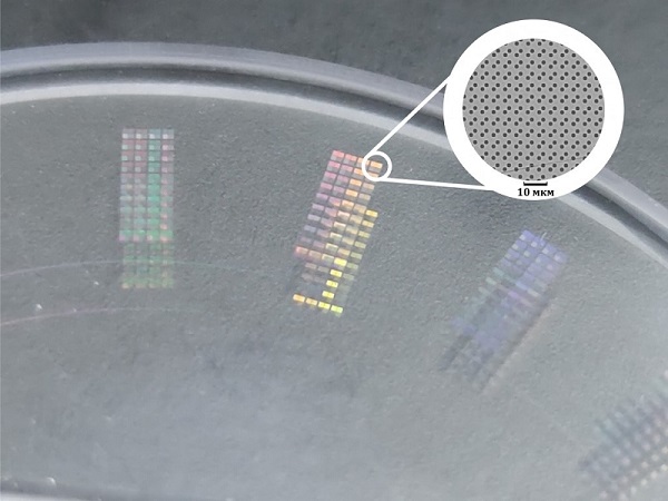 «Метки» имеют вид микрорешёток, состоящих из точек в шахматном порядке, которые при прохождении света через них формируют сложную дифракционную картину. Микрорешётки, как и сама голограмма, создавались на поверхности кварцевого стекла с помощью лазерного излучения.