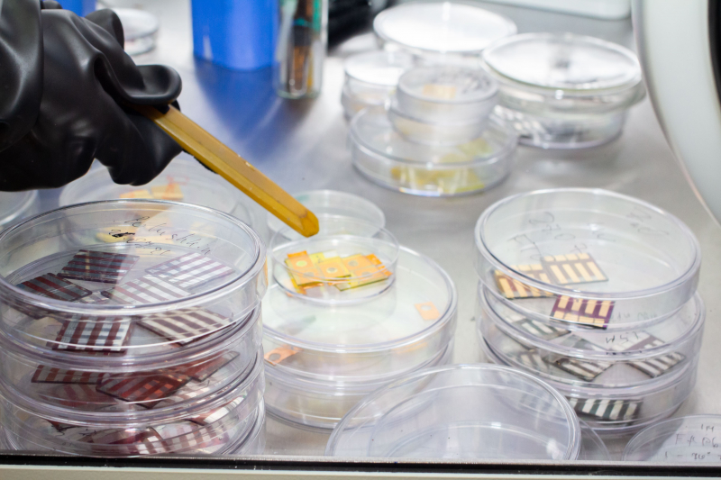 Солнечные элементы производятся методом spin coating (последовательное проливание жидких слоев друг поверх друга). Это позволяет создавать очень тонкие пленки, а также гибко варьировать их толщину и концентрацию.