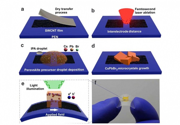 Рабочий элемент предложенного учеными устройства ― кристаллы перовскита, лежащие между двумя электродами из углеродных нанотрубок толщиной в 20 нанометров. Чтобы избежать рассеивания генерированных в фотодетекторе зарядов, исследователи разрезали с микронной точностью пленку углеродных нанотрубок на две полоски. Канал между полосками электродов заполняют проводящим материалом — перовскитом. Синтез кристаллов проводят напрямую на пленке из раствора при низких температурах.