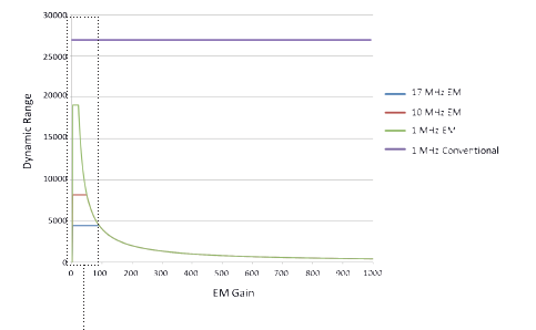 Calculating dynamic range in EMCCDs has often been a source of confusion, due to the additional requirement to factor in EM gain and the extended well capacity of the gain register. High dynamic range can be accessed in EMCCDs with careful fine tuning of EM gain.