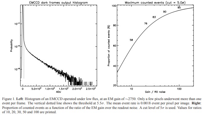 Electron Multiplying Charge Coupled Devices (EMCCD) allows one to apply a gain to the pixel’s charge before it reaches the noisy output amplifier where the charge-tension conversion is made.2 A gain G in the charge domain affects the effective readout noise by the relation σef f = σreal G . Sub-electron effective readout noise levels are thus achievable. However, the electron multiplying process is stochastic. This statistical behaviour adds an excess noise factor that reaches a value of 2 1/2 at high gains.3 The effect on the signal-to-noise ratio (SNR) of the system is the same as if the quantum efficiency (QE) of the CCD would be halved.