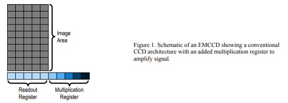 The FIREBall-2 detector development is a collaborative effort shared between the Jet Propulsion Laboratory (JPL), the California Institute of Technology, and Columbia University. The detector is based on e2v’s CCD201-20, an electron multiplying charge-coupled device (EMCCD). EMCCDs are conventional CCDs in which one of the register phases is replaced with a high voltage (40-50 V) gain register that multiplies charge prior to readout (Figure 1).7 Depending on the applied voltage, EMCCDs can amplify electron signals by several thousand times, effectively eliminating read noise by allowing the device to operate as a photon counter.8,9 EMCCDs are well suited for the FIREBall-2 experiment, which will map faint targets.