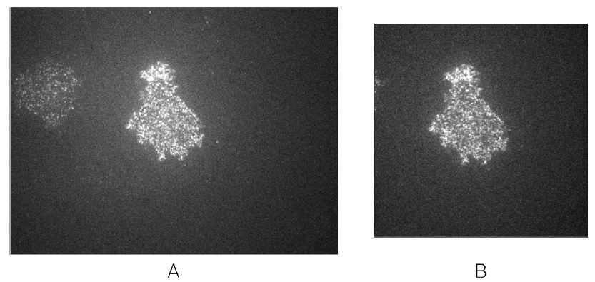 Рисунок 1: Изображение молекулы β2-адренорецептора: Экспрессированный белок с флуоресцентной меткой в живой клетке, освещенный по методу флуоресцентной микроскопии полного внутреннего отражения (TIRF). Изображение было одновременно получено на Aries-16 (изображение слева, пиксель 16 мкм) и EMCCD (изображение справа, пиксель 16 мкм), время экспозиции 30 мс, объектив с увеличением х100.