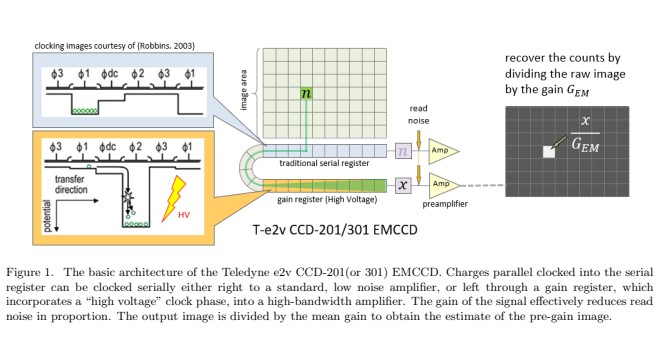 The best CCD’s currently achieve about 3 electrons (e −) of read noise, and even at this rate, read noise becomes by far the dominant noise source. Since the instrument is being operated in the space environment, with significant rates of cosmic rays, frame times must be kept relatively short. Integration with higher frame rate makes the per-read classes of noise, chief among them read noise, more important. Electron multiplication CCD’s (EMCCD’s) can dramatically reduce read noise by amplifying the signal through successive impact ionization events. Each pixel’s charge packet in these devices is clocked out as usual but in the last stage, it is passed through a serial gain register prior to read out. Roman CGI uses a mission-optimized version of the Teledyne e2v CCD-201 EMCCD, designated as the CCD-301, featuring mitigation for charge traps and cosmic ray tails. In the CGI’s two cameras, this EMCCD will be operated with gains as high as 7500. The amplified image, sometimes also called the ’analog’ or ’proportional’ image, is enhanced by a factor of the EM gain, GEM, so that the best estimate image is obtained by dividing every pixel by the EM gain (a single scalar number for the whole image).